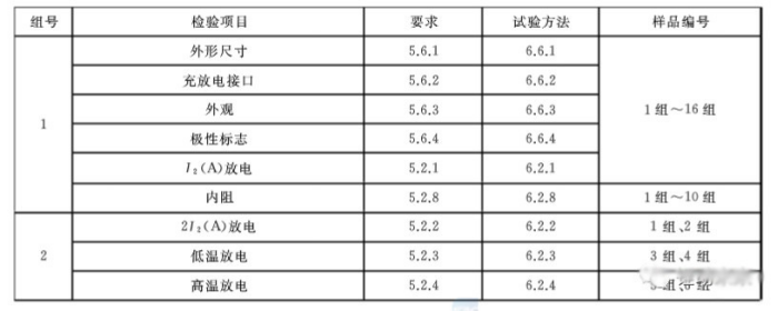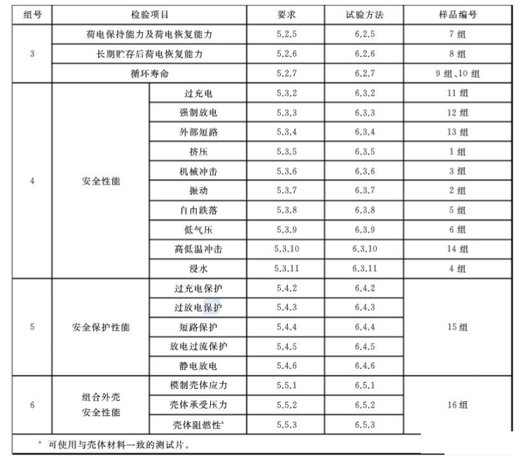 全項(xiàng)目檢測需要樣品16組,分為電性能測試、安全測試、安全保護(hù)能力測試、組合外殼安全測試四大部分,標(biāo)準(zhǔn)未對電芯進(jìn)行質(zhì)量要求,建議后續(xù)可參照GB31241對其電芯進(jìn)行測試,型式試驗(yàn)項(xiàng)目表如下。
