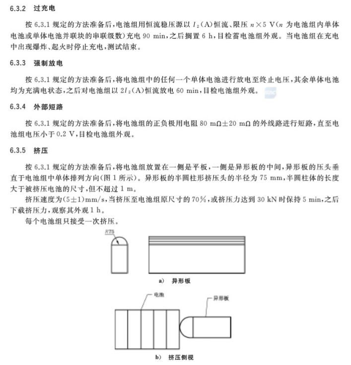 標(biāo)準(zhǔn)條款中,過充電、強(qiáng)制放電、外部短路、擠壓、浸水、殼體阻燃性為本標(biāo)準(zhǔn)中難度較大的檢測項(xiàng)目,需要相關(guān)企業(yè)給與高度關(guān)注。過充電、強(qiáng)制放電、外部短路要求電池組拆除保護(hù)裝置后測試,對電芯安全性能、pack工藝、保險絲等提出了很高的要求;擠壓項(xiàng)目中30kN擠壓力或變形至70%,對電池組外殼、電池支架結(jié)構(gòu)等提出了很高要求;電池組外殼應(yīng)滿足V0防火阻燃等級要求,高于電動自行車國標(biāo)中的V1等級要求;浸水測試對電池組IP防護(hù)等級提出了較高要求。GB/T36972-2018《電動自行車用鋰離子蓄電池》文本正式公布